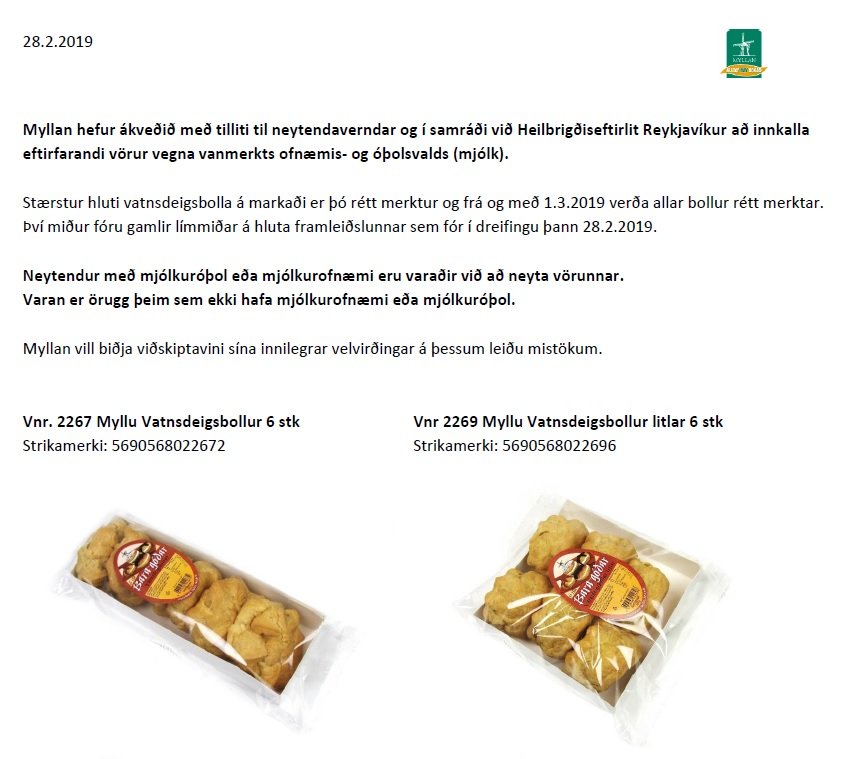 Innköllun-ómerkt mjólk í vatnsdeigsbollum