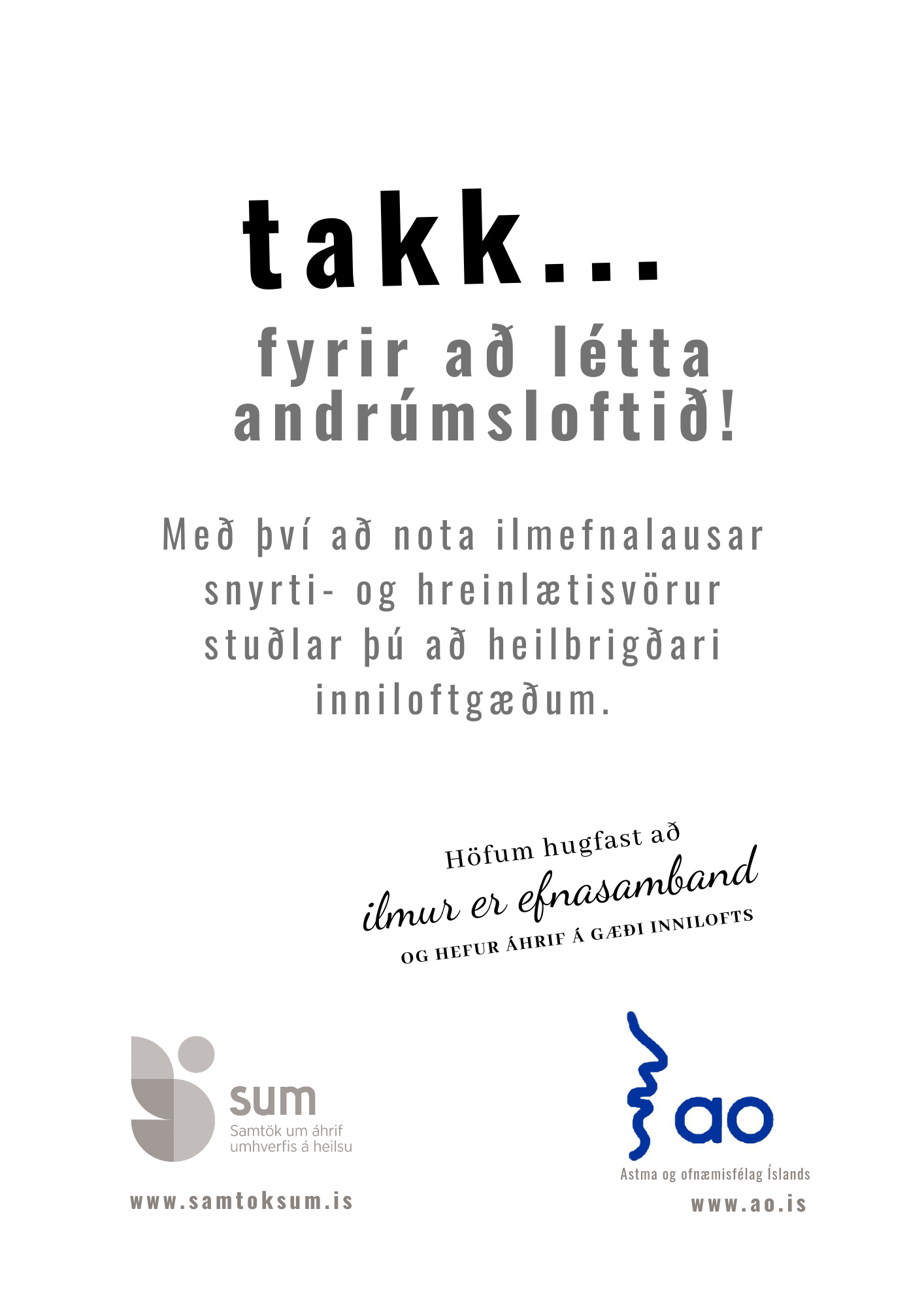 Astma- og ofnæmisfélag Íslands hefur ákveðið að taka þátt í samstarfsverkefni Samtaka um áhrif umhverfis á heilsu (SUM) um vitundarvakningu varðandi notkun ilmefna á vinnustöðum og opinberum svæðum. Markmið verkefnisins er að draga úr óþægindum og heilsutengdum vandamálum sem ilmefni geta valdið, sérstaklega fyrir fólk með astma og ofnæmi.